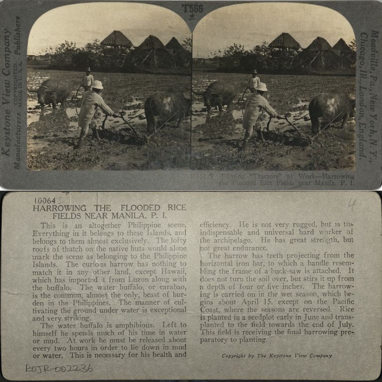 Keystone #K10064-I. Filipino farmers use carabao to plow and harrow muddy rice fields near Manila, Philippines.
