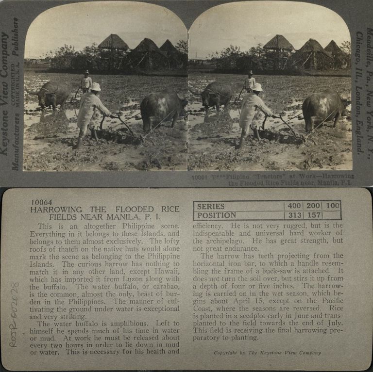 Keystone #K10064-I. Filipino farmers use carabao to plow and harrow muddy rice fields near Manila, Philippines.