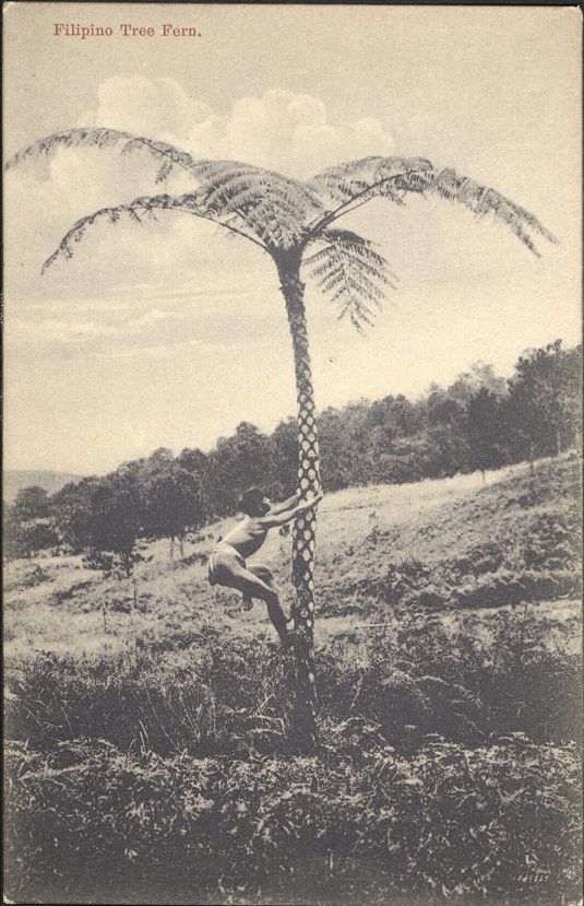 Subject: Young boy climbs trunk of lone tree fern. Tree ferns grow in tropical and subtropical areas, as well as temperate rainforests in South Africa, Australia, New Zealand, and they can reach 10m (