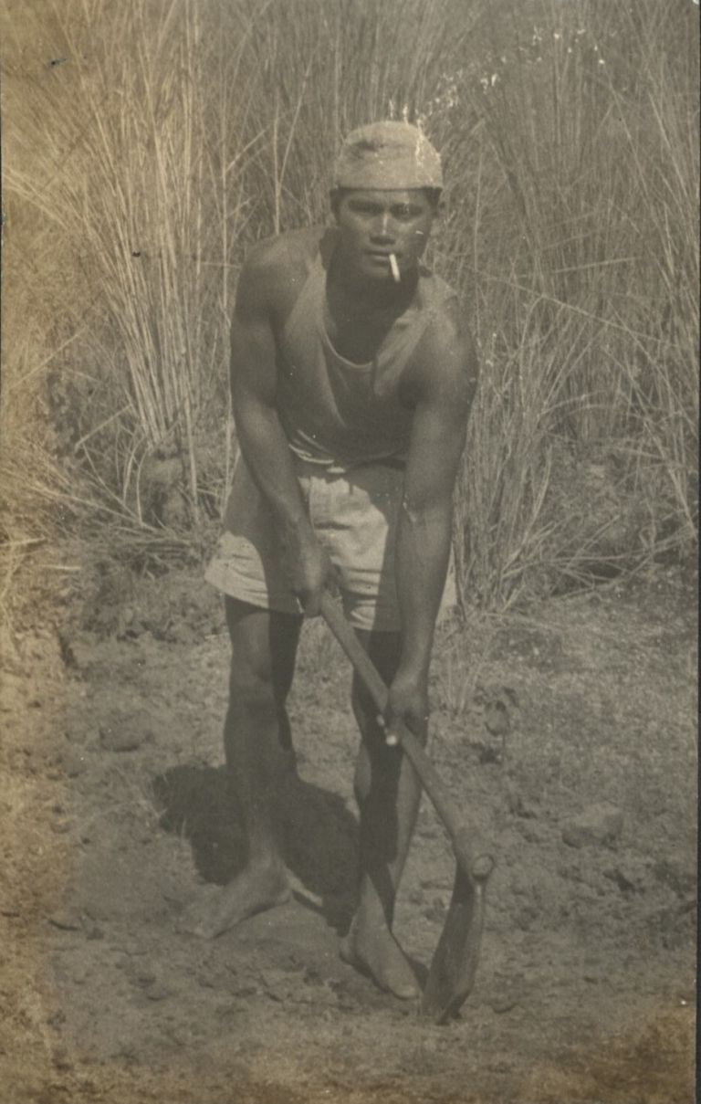 Subject: Filipino man digging hard ground with a hoe or azada still has time to smoke a cigarette.