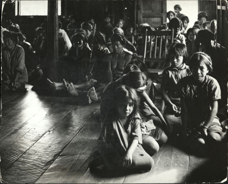 Subject: Group of Filipinos sit on a floor of rough-hewn hardwood planks inside a small, darkened church building in Luzon.