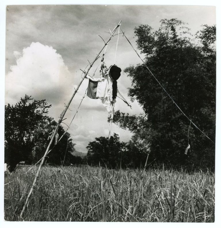 Scarecrow hanging from an overhead bamboo tripod in a Philippine rice field. Full caption continues: "2. Lest the valuable rice crop be damaged or destroyed by the birds, the Filippino [Filipino] rice grower has known and employed the figure of the scarecrow just as we in the West. The scarecrow speaks all languages! Evans 2662."