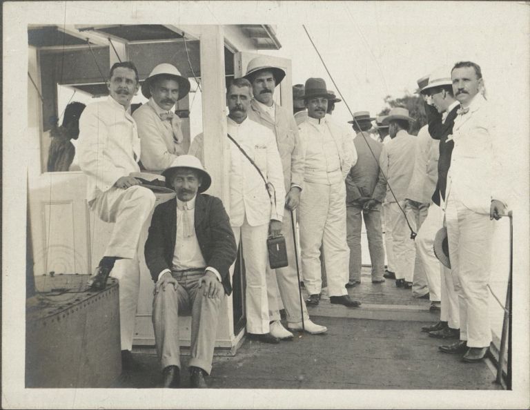 Subject: Group of expatriate men pose on board a boat. Presumably this is the sternwheeler "Santa Rosa," seen also in OFI-002421, OFI-002437, and (possibly) in OFI-002407.