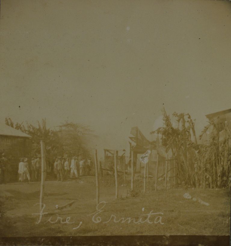 Subject: Group of men gather near a fire (of which we can see only the smoke) in Ermita, Manila. See also OFI-002167 and OFI-002307.