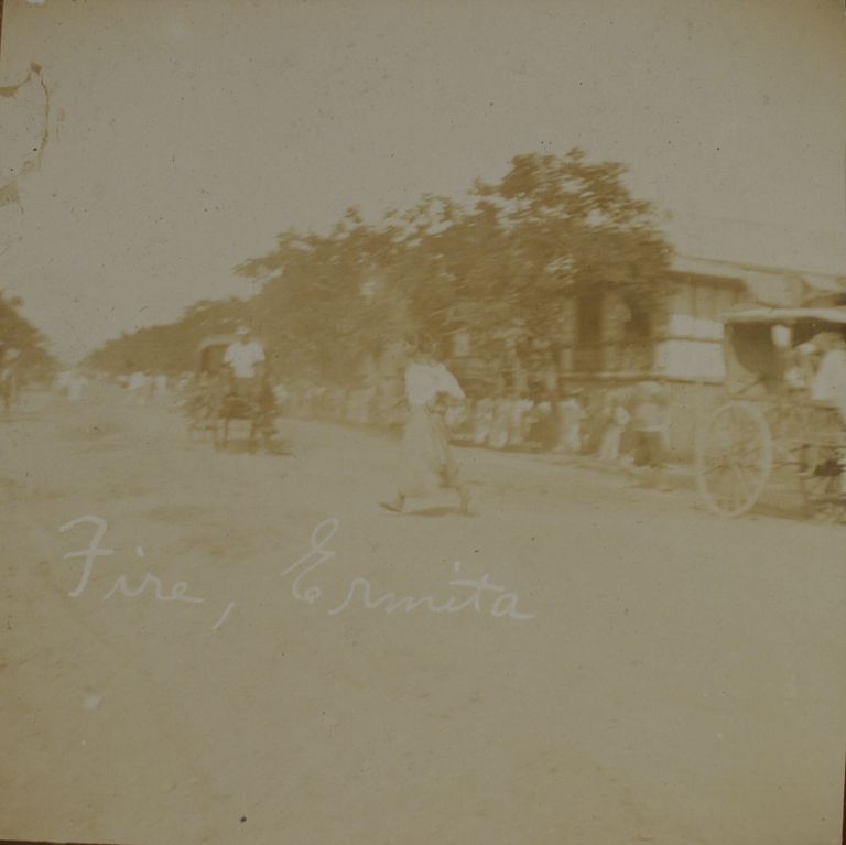Subject: One of three photos in this album documenting a fire in Ermita, Manila, although in this one it's not clear where the flames and smoke are. See also OFI-001942 and OFI-002167.