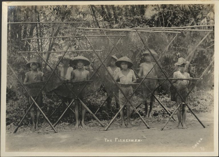 Subject: Filipino young men and boys pose with bamboo-and-net fish traps on the shore. It's inclear if these are seines (intended to net the fish) or weirs (intended to direct the movement of fish int