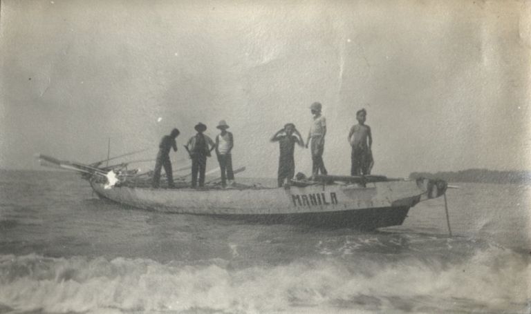 Subject: Fishermen stand in a boat at the shore, probably at Ilocos Sur based on the sequence of the album.