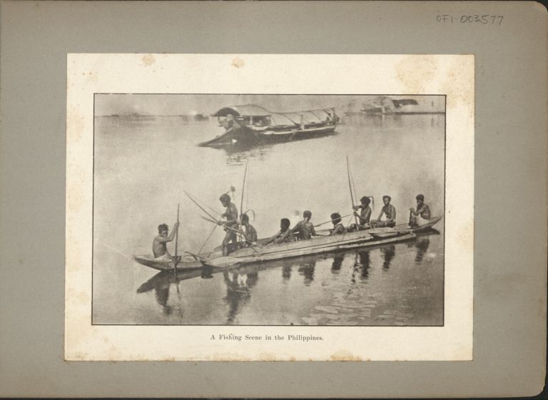 Subject: Nine Filipino men in a banca bowfishing in a river or bay, with a casco in the background. Givens was the post photographer at the Presidio of San Francisco star