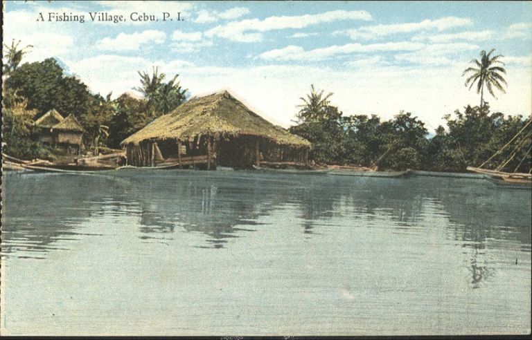 Subject: Large nipa boathouse at edge of calm lagoon on Cebu.