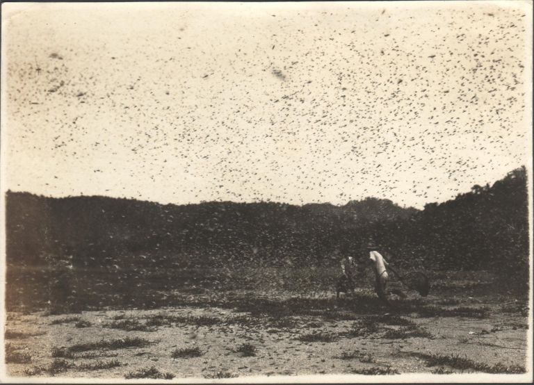 Subject: A cloud of locusts swarm while Filipinos try to catch them in nets. Probably Locusta migratoria manilensis, commonly known as the Oriental migratory locust. It is normally a solitary insect