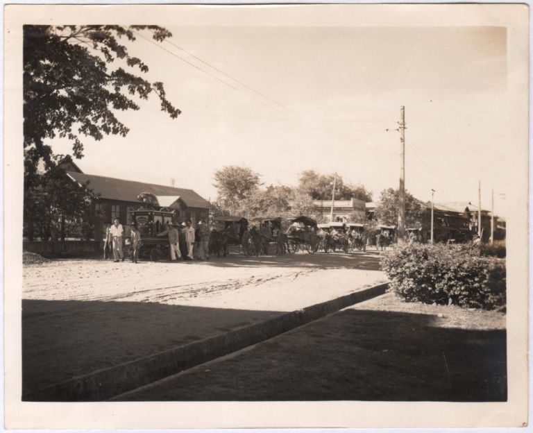 Filipinos line up on foot and in carriages behind a funeral coach in a street for a funeral procession. "Flip" was (and is) colloquial slang for Filipino. Images in this album are from an American soldier in the U.S. Army 13th Air Force stationed at Clark Field.