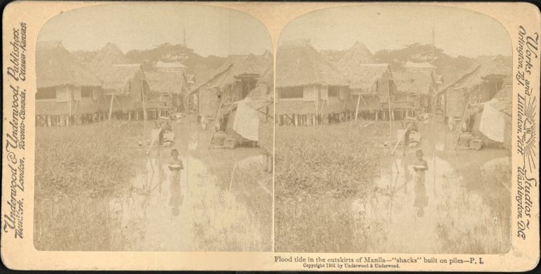 Underwood #U325b. Children in flooded field in front of nipa huts.