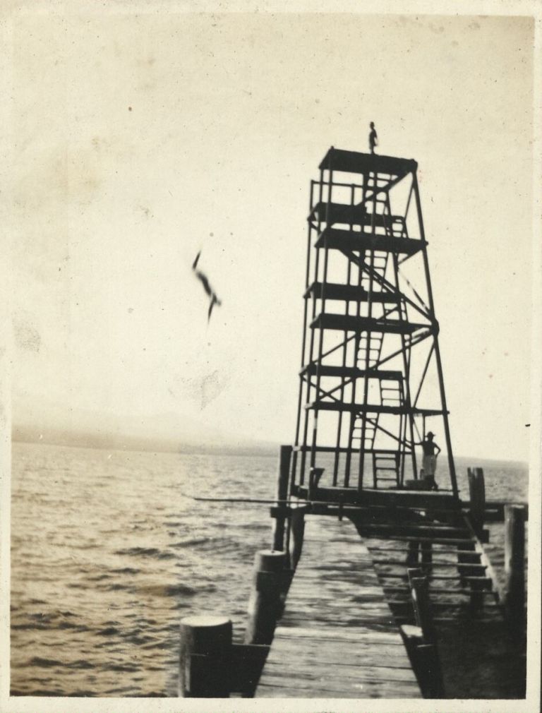 Subject: Man caught by the camera in mid-air, diving off a platform at the end of a pier into Manila Bay. This may be part of a military training program, rather than purely recreational.