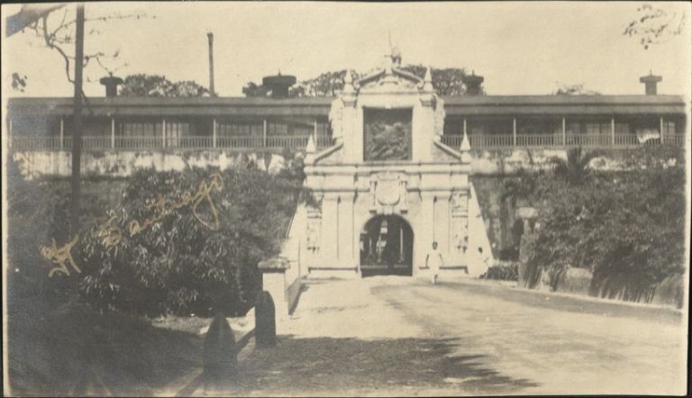 Subject: Ornate stone entrance gate into interior of Fort Santiago in Intramuros, See also ROJR-000430 for a nearly identical view as a colored postcard.