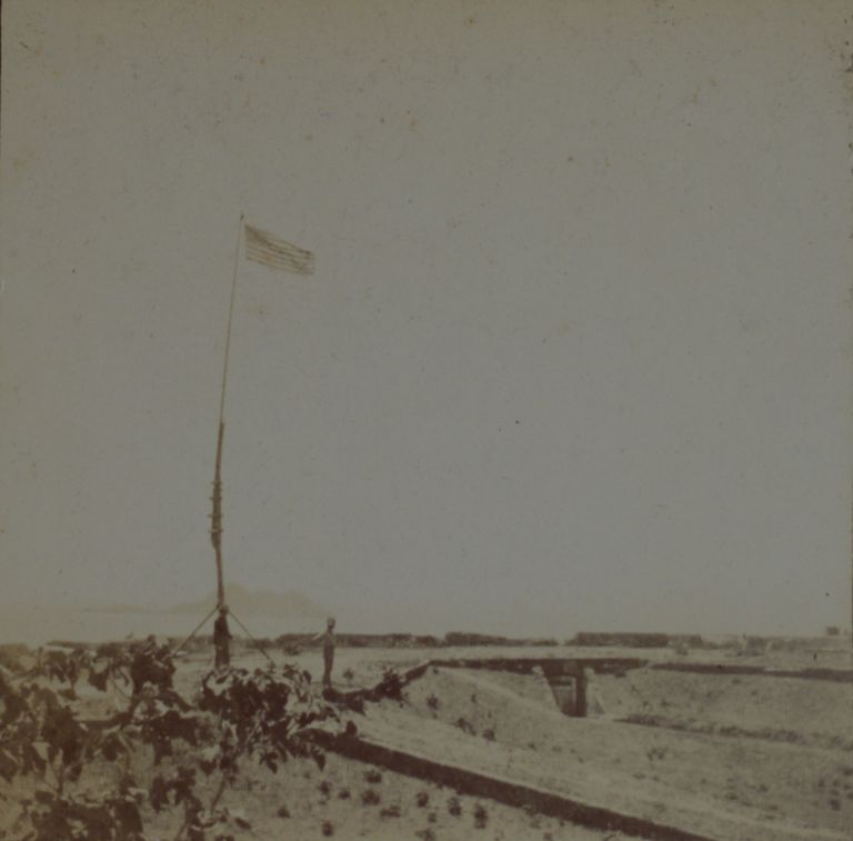 Subject: A makeshift flagpole flies the U.S. flag above Fort Santiago in Intramuros.