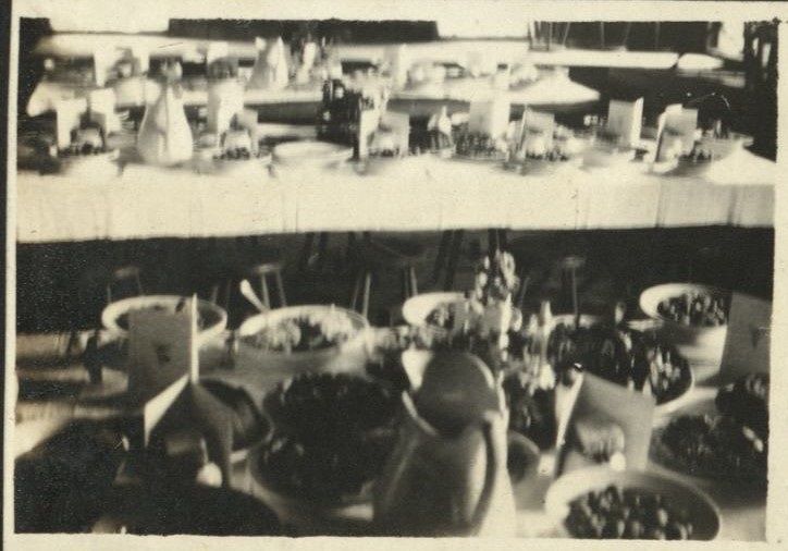 Subject: Series OFI-004640-4642 show the table settings, decoration, and food set up in preparation for Christmas dinner for the men of 8th Company (probably of the Coast Artillery), Fort Wint, Grande
