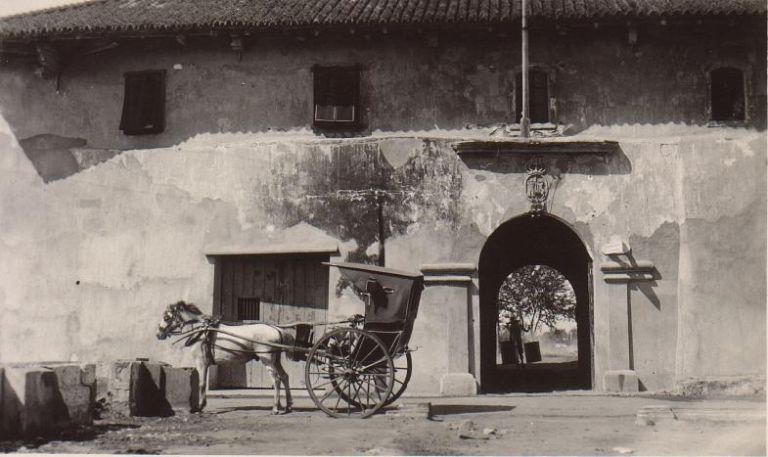 Subject: Horse and calesa wait outside arched gate through white building, possibly in Intramuros in Manila. This image was also published as a printed postcard; see ROJR-001636.