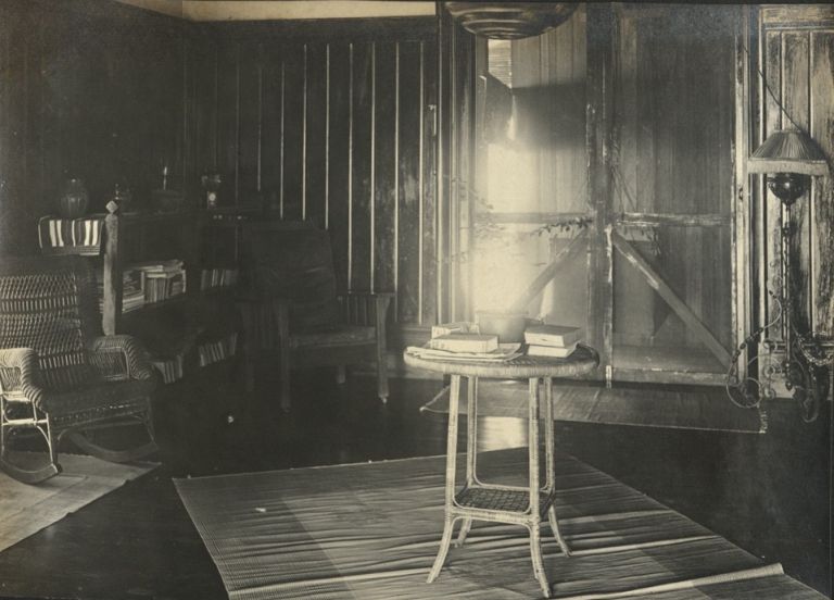 Subject: A sala or living room with wicker furniture, table, bookshelf, rugs, and a screen door. No location is given, but this is probably one of the officers quarters' where the Baird family lived i