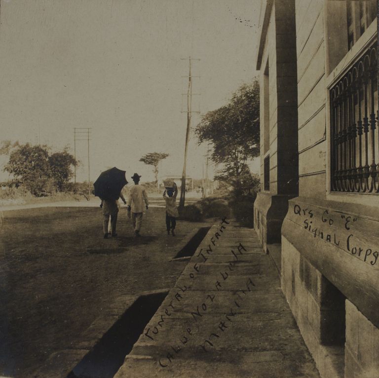 Funeral of infant, Calle Nozaleda, Manila. [Building on right:] Qrs. Co. [Quarters, Comapny] "E," Signal Corps.