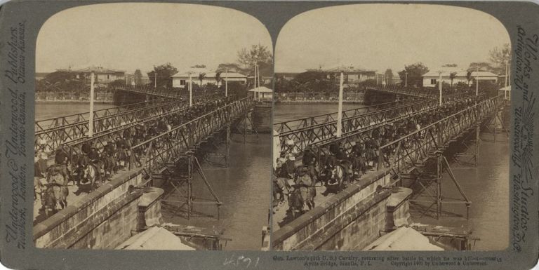 Gen. Lawton's (4th U.S.) Cavalry, returning after battle in which he was killed - crossing Ayola [Ayala] Bridge, Manila, P. I.