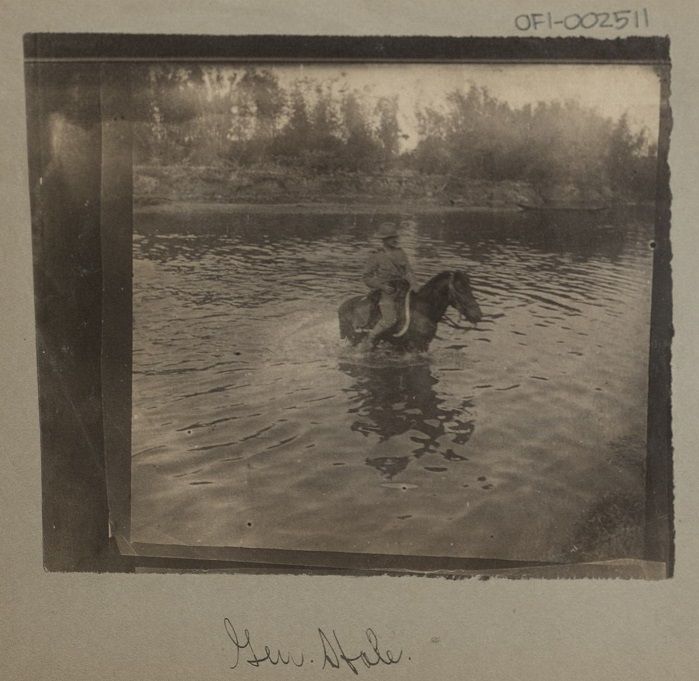 Subject: General Stale of the U.S. Army crosses a Philippine river on horseback. Lieut. Munson M. Z. Guthrie was an officer in Company A, 1st South Dakota Volunteer Infantry, which served in the Phil
