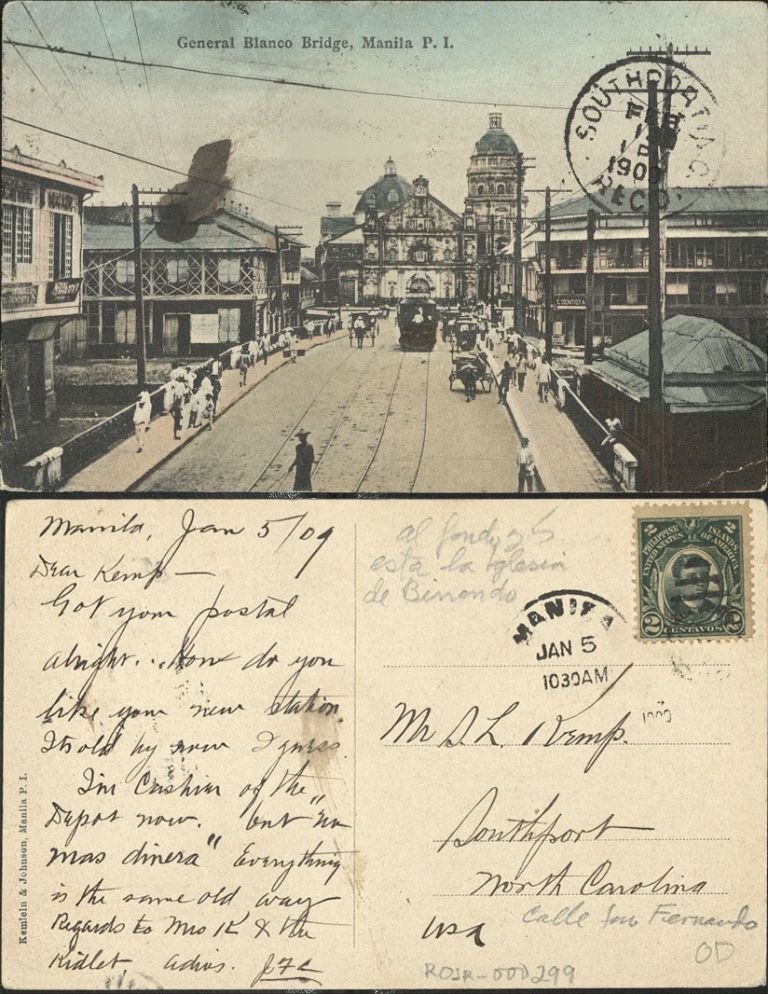 Subject: View across General Blanco Bridge crossing Binondo Canal, with streetcar, calesas, and pedestrians; Binondo Church distant. Ram�n Blanco was Governor-General of the Philippines (1893-1896).
