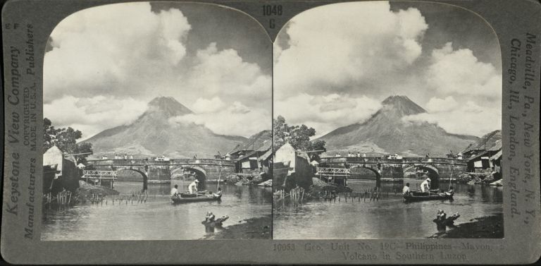 Keystone #K10053-IV. Mt. Mayon, a symmetrical volcano in Albay province of southern Luzon, seen beyond a river and old Spanish stone arch bridge in Legaspi City.