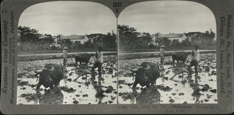 Keystone #K37483. Filipino farmers use carabaos (water buffaloes) to plow a muddy rice paddy.