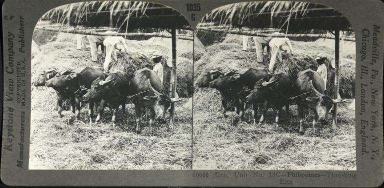 Keystone #K10068-II. Filipino farmers use 4 carabao to trample rice stalks to remove, or "thresh out," the grains.