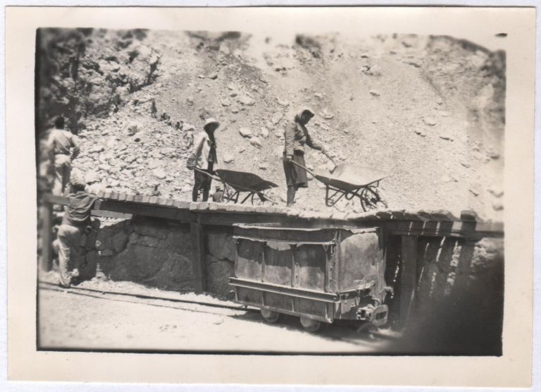 Laborers hauling gold ore in wheelbarrows from a mountainside to a little ore cart on rails.