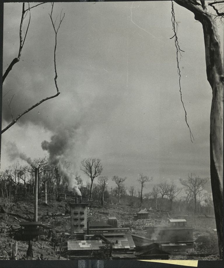 Subject: Dead trees surround a smelter belching smoke in Nueva Ejica. Full caption continues: "Gold smelting plant of the Marsman Company at San Mauricio in the Philippine province of Luzon, the only
