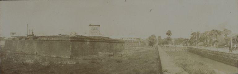 Subject: Intramuros walls and weed-choked moat in Manila. In foreground is Baluarte de San Gabriel, with Puerta de Isabel II in distance. The tower visible is the same one seen in OFI-00006