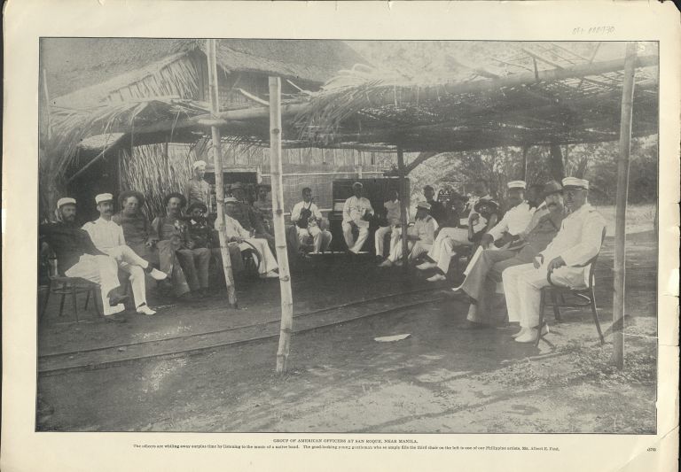Subject: U.S. Army officers and entourage sit comfortably in chairs under cover as a Filipino music combo performs. San Roque is connected to the Cavite Navy Yard by a causeway. For detail