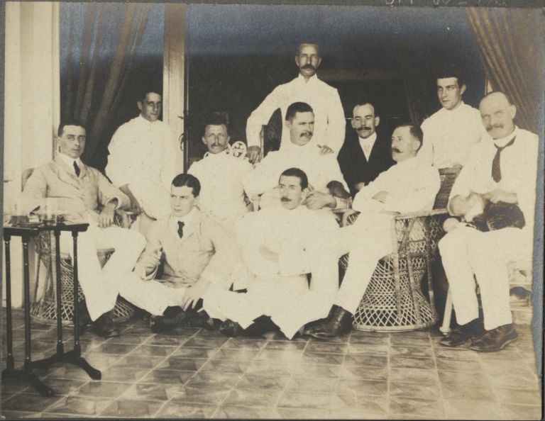 Subject: Group portrait of 11 expatriate Caucasian men seated in a sala or living room. Perhaps this is the Santa Ana, Manila staff of this company. See also OFI-002377 for another image of this event