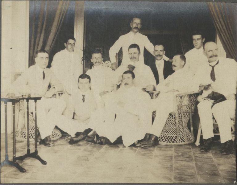 Subject: Group portrait of 11 expatriate Caucasian men seated in a sala or living room. Perhaps this is the Santa Ana, Manila staff of this company. See also OFI-002352 for another image of this event