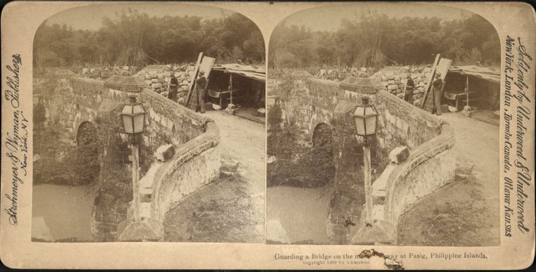 Underwoood #U1100. Two U.S. soldiers stand guard at a checkpoint at a bridge crossing a stream, Pasig City, Philippines.