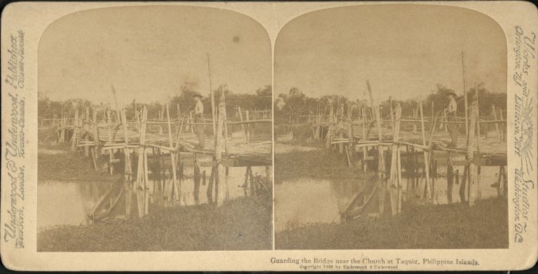 Underwoood #U1105. U.S. soldier stands guard at bamboo bridge in Taguig, Philippines.