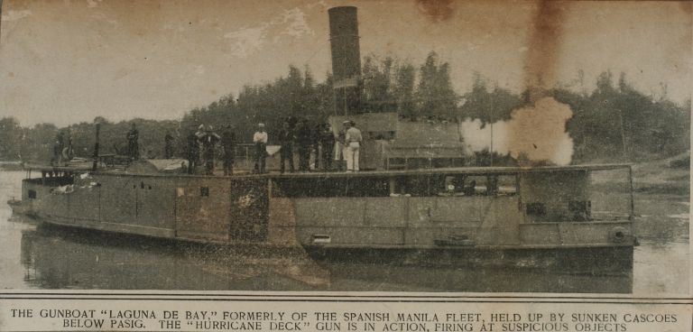 The gunboat "Laguna de Bay," formerly of the Spanish Manila fleet, held up by sunken cascoes below Pasig. The "hurricane deck" gun is in action, firing at suspicious objects.