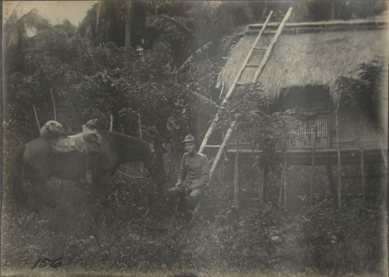 Subject: A U.S. soldier with his horse take a rest break next to a nipa hut. The man is sitting on a rung of a bamboo ladder.