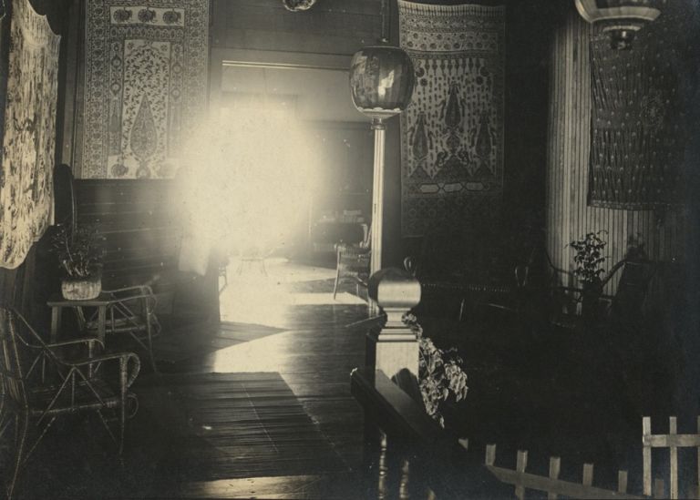 Subject: A hallway with wicker chairs, a bench, rugs, and a collection of batik fabrics used as wall hangings. No location is given, but this is probably one of the officers quarters' where the Baird