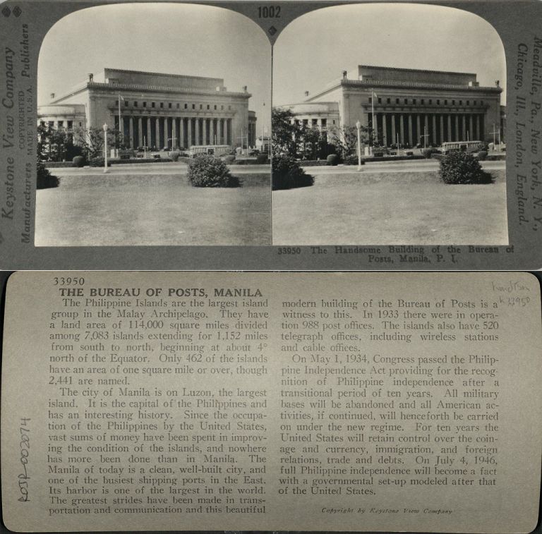 Keystone #K33950-I. Front of main Manila post office seen across park.