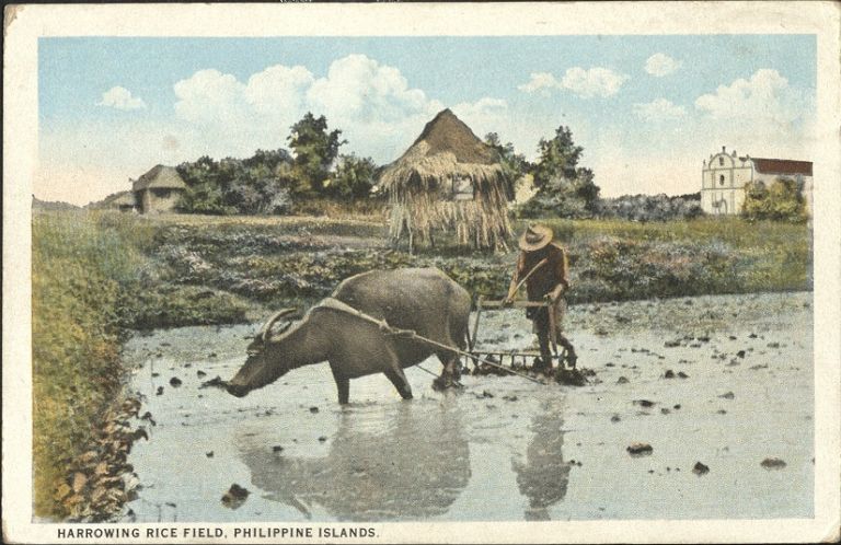 Subject: Man with carabao plows flooded rice paddy with a harrow; buildings in distance.