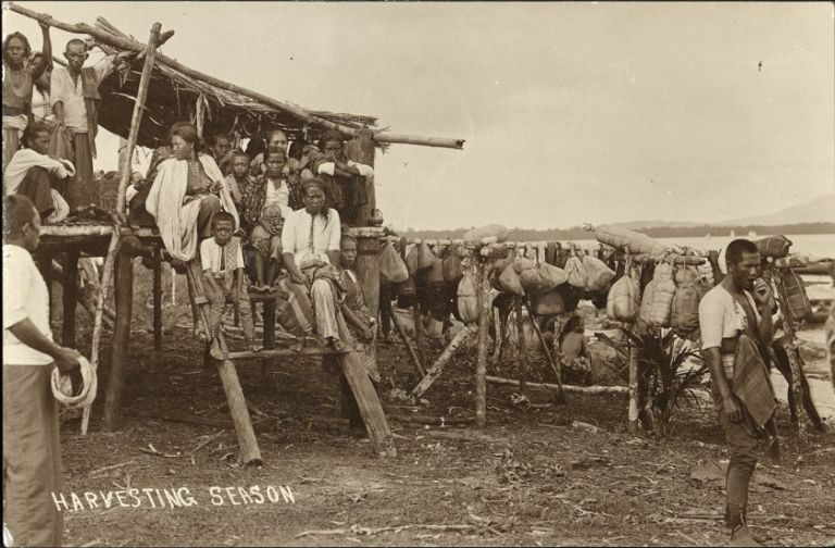Subject: Men, women and children helping with rice harvest sit in shed next to lake or sea.