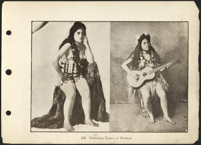Subject: Two studio portraits of Hawaiian women, both topless, in native dress. One is playing a guitar. Givens was the post photographer at the Presidio of San Francisco starting in 1899.