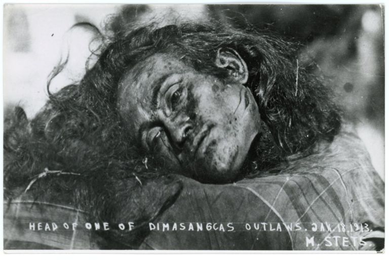 Severed head of an executed Filipino outlaw. Dimasangca is a barangay in Labangan, Zamboanga del Sur. A similar photo is captioned, "a reward of P500 was offered by the Moro government."