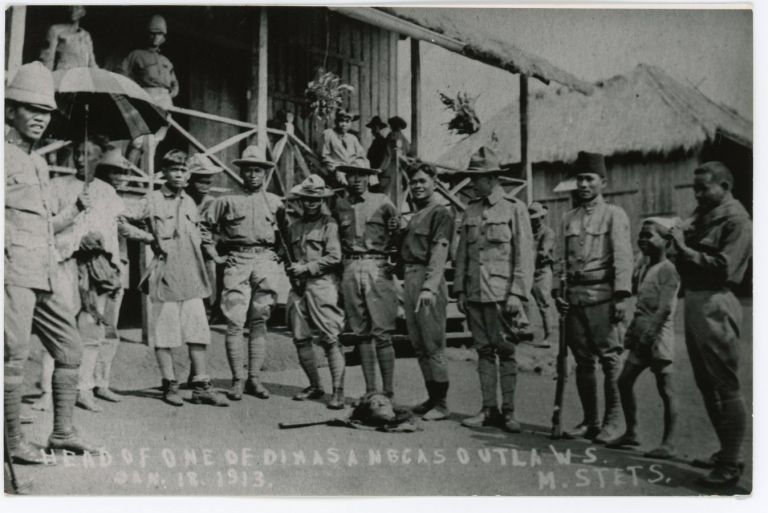 Group of Moro constabulary show off the severed head of an executed Filipino outlaw. Dimasangca is a barangay in Labangan, Zamboanga del Sur.