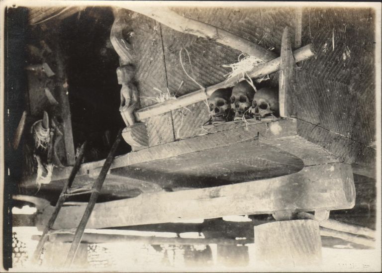 Subject: Three human skulls displayed at a native home, likely the victims of headhunters. See also ROJR-001482.