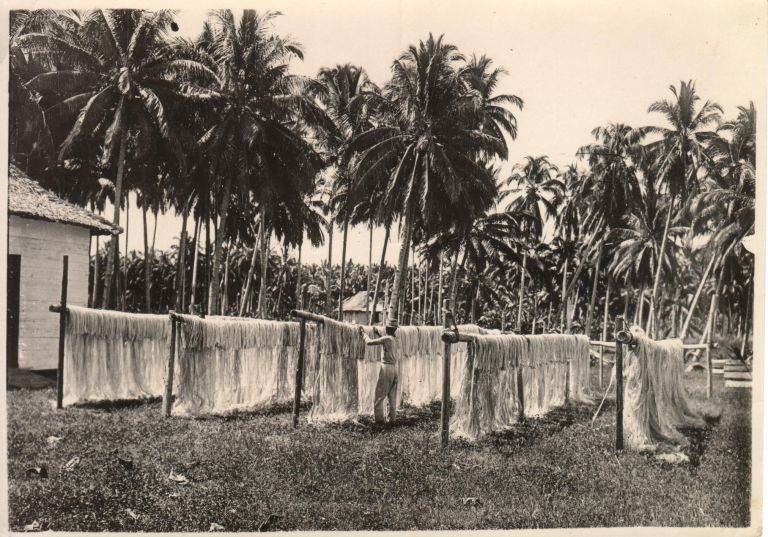 Subject: Man attends to abaca hemp fibers drying on 5 tall racks in a Philippine village. See also ROJR-001138 for this same image as a printed postcard.