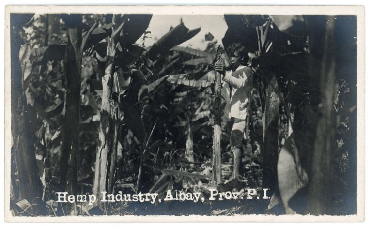 Filipino man stands amid leafy hemp plantation in Albay province. Philippine hemp is a buff-colored fiber obtained from Musa textilis, a relative of edible bananas; it is also called Manila hemp.