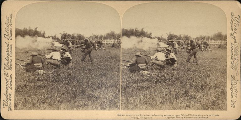 Heroic Washington Volunteers advancing across an open field - Filipinos 800 yards in front - Taquig [Taguig], Philippines.